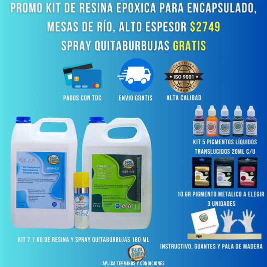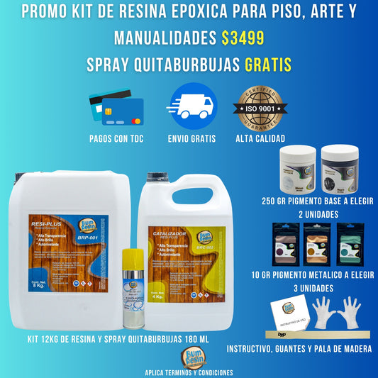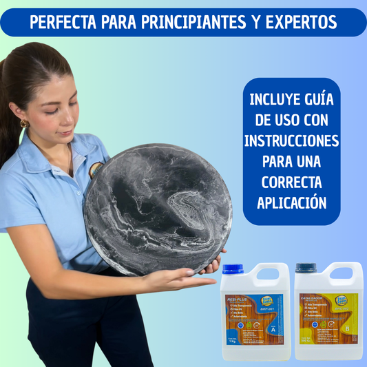 - Resina Resi-Plus (baja viscosidad) relación de mezcla 2:1, tiene un tiempo de curado de 24 horas y es usada principalmente en trabajos como recubrimientos, piso epóxico, joyería, decoración de superficies, etc.